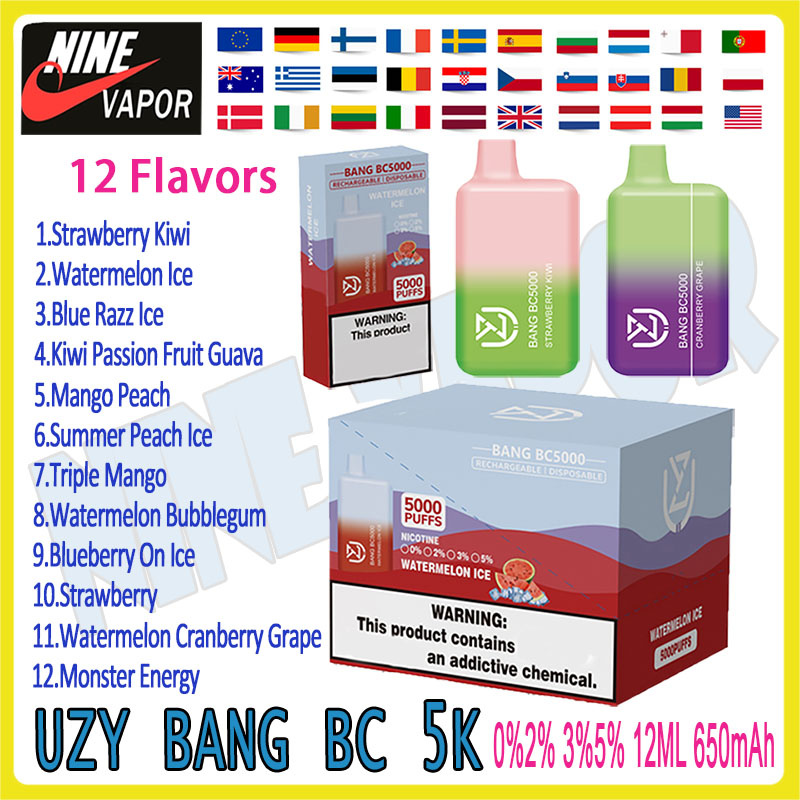 UZY Bang BC5000 Disposable Vape Pen 5000 Puffs, Rechargeable, 12ml, 12 Flavors, Customizable