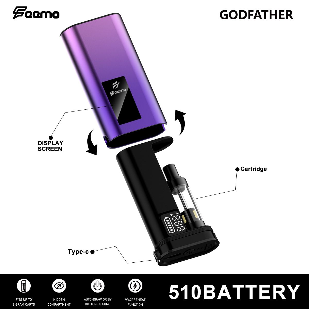 Wholesale Feemo Godfather Vape Battery 650mAh with Custom Logo & Adjustable Voltage for 3ml Cartridge